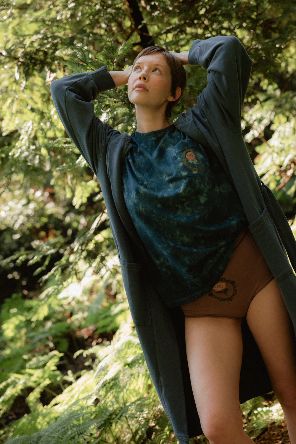 We use plant-based fabrics like TENCEL™ lyocell, ECOVERO™ viscose, and organic cotton, blended with Creora® bio-based spandex for gentle stretch. While the spandex still contains some petroleum, it’s partially derived from renewable sources—making it a better option than traditional synthetics. The result: soft, breathable, lower-impact clothing that feels as good as it is.
