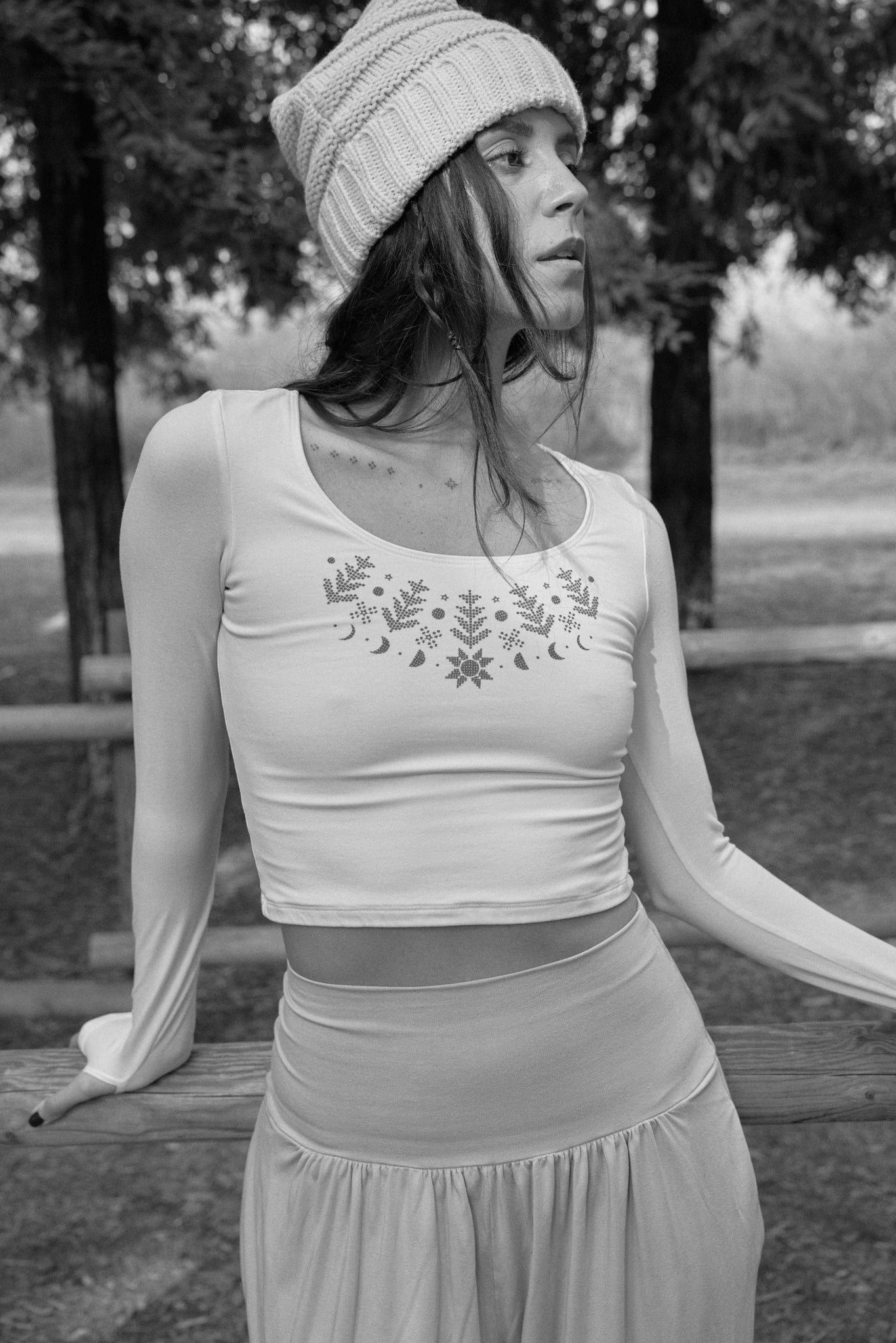 Inspired by cross stitch, winter, and the moon, wearing our cabin moon phase print reminds us to be gentle with ourselves no matter what phase we’re in. We are held, safe, and loved just as we are.