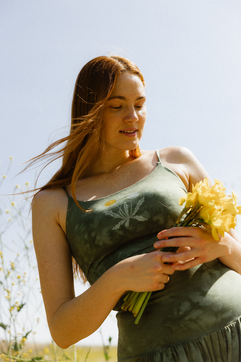 We recommend going up one size. Our fabric stretches beautifully and accommodates your body through pregnancy and beyond. The tops are also breastfeeding-friendly.