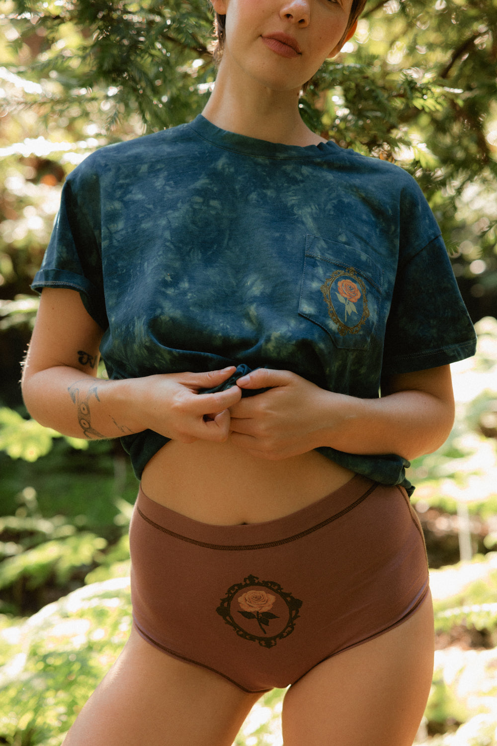We knit our fabrics in Los Angeles, work with a GOTS-certified dye house, and print exclusively with water-based inks. Every design is created in collaboration with female artists, and all of our production partners are small, family-owned studios located within a 25-mile radius of downtown LA, bringing our vision to life with care and integrity.