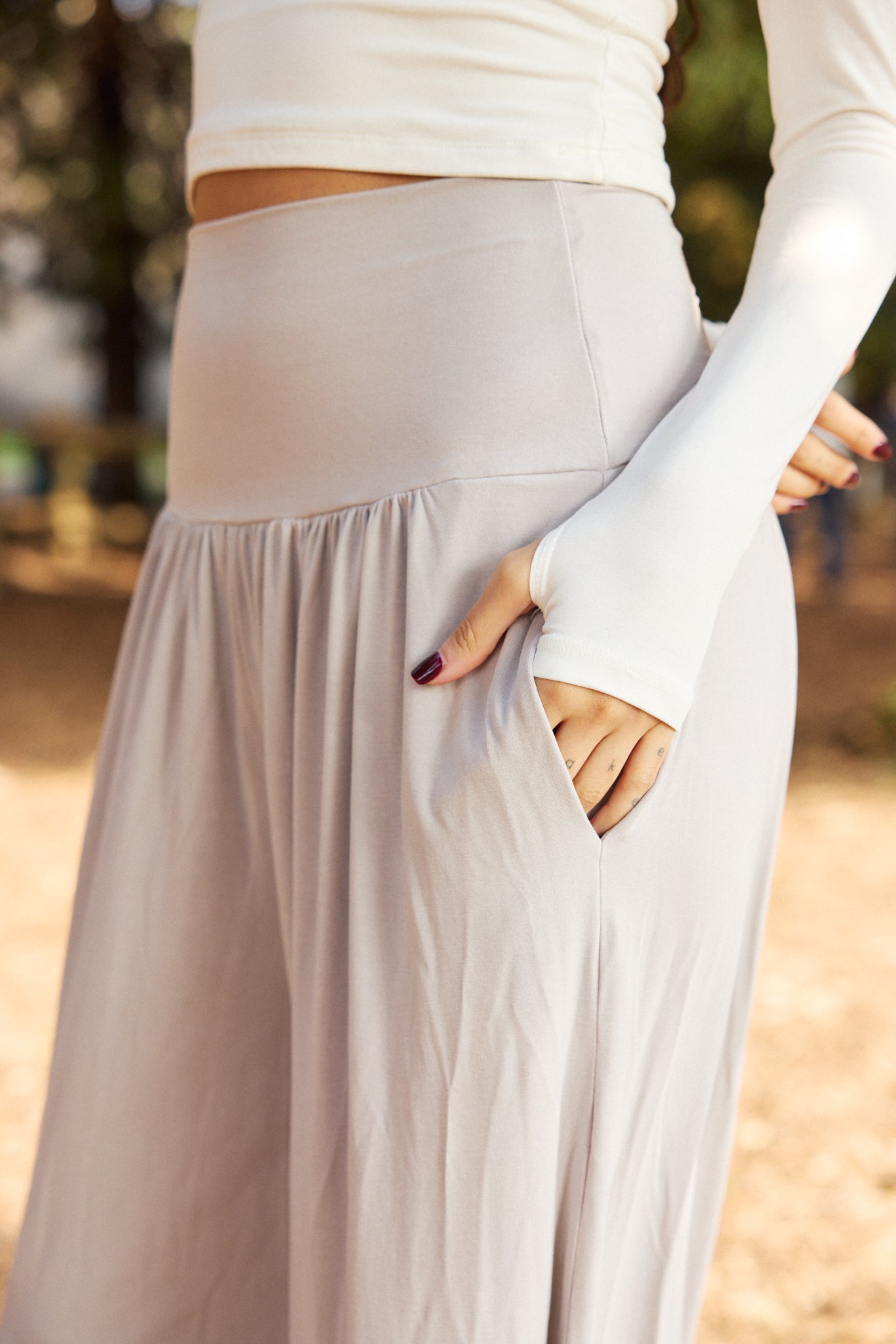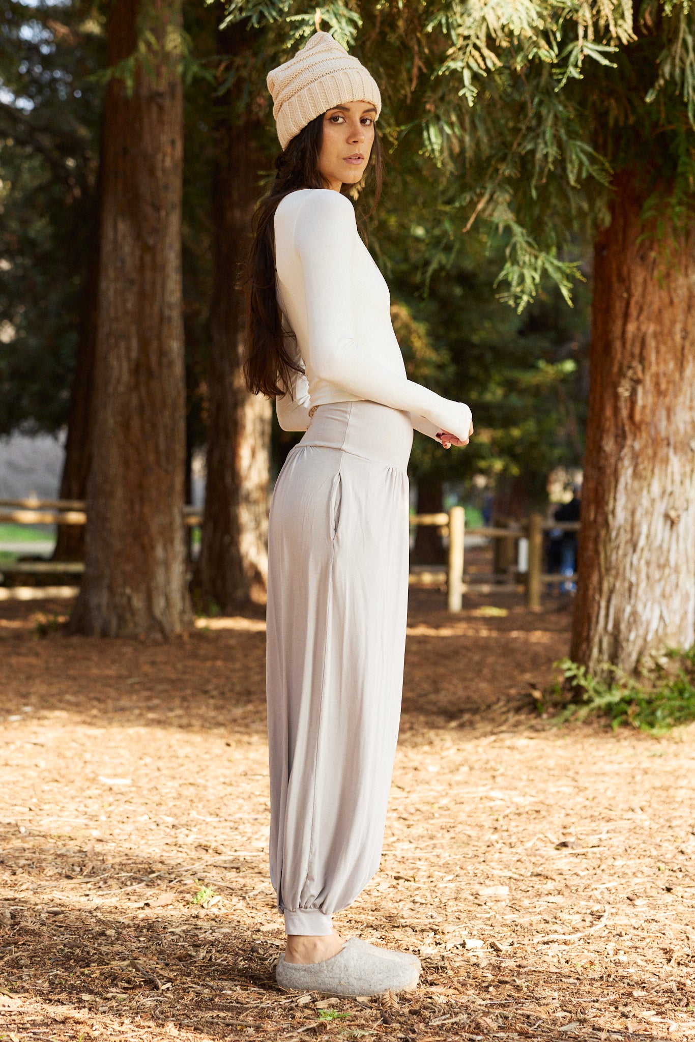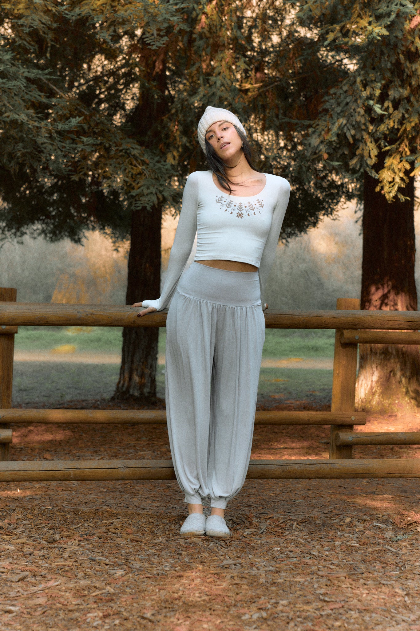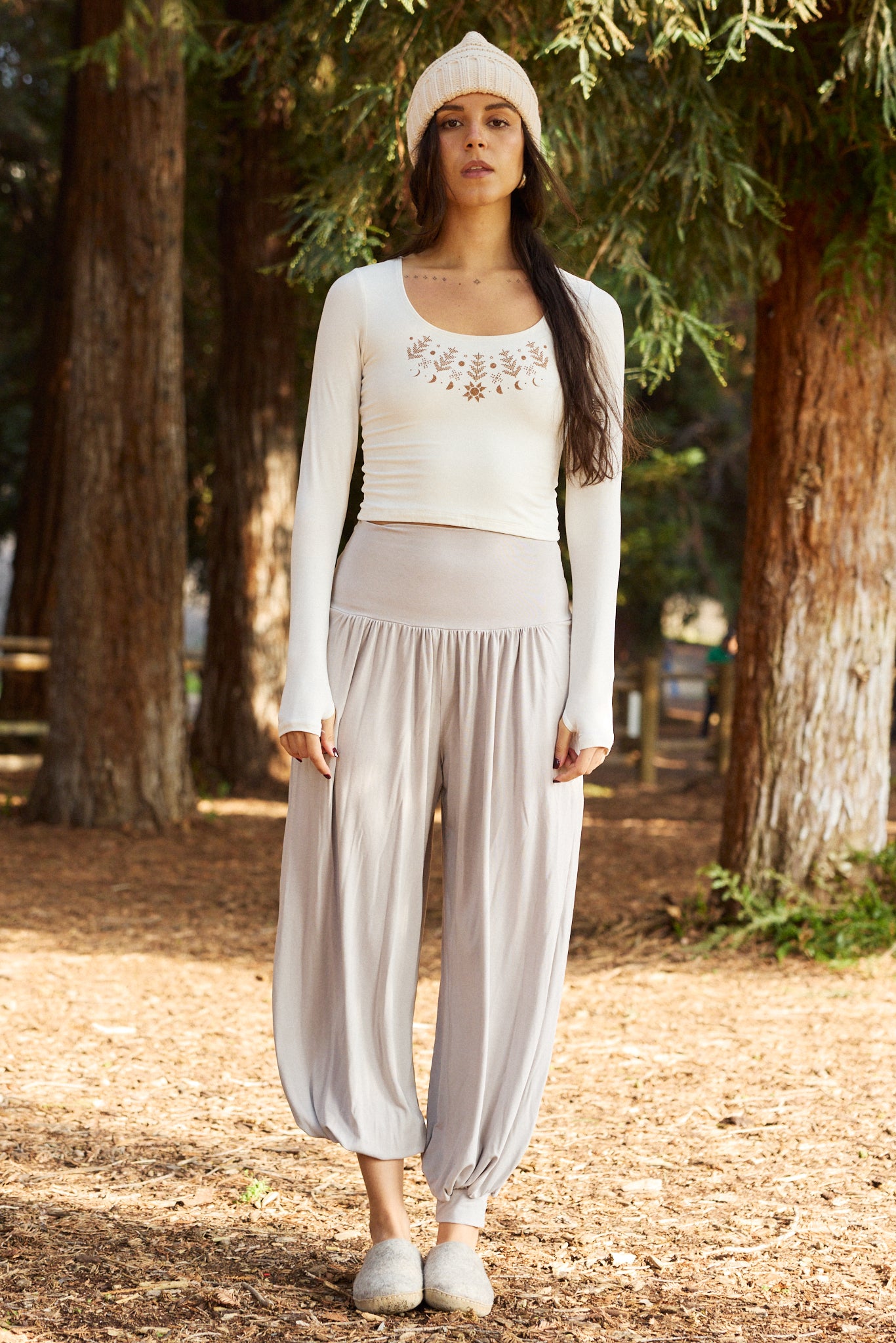 We use plant-based fabrics like TENCEL™ lyocell, ECOVERO™ viscose, and organic cotton, blended with Creora® bio-based spandex for gentle stretch. While the spandex still contains some petroleum, it’s partially derived from renewable sources—making it a better option than traditional synthetics. The result: soft, breathable, lower-impact clothing that feels as good as it is.