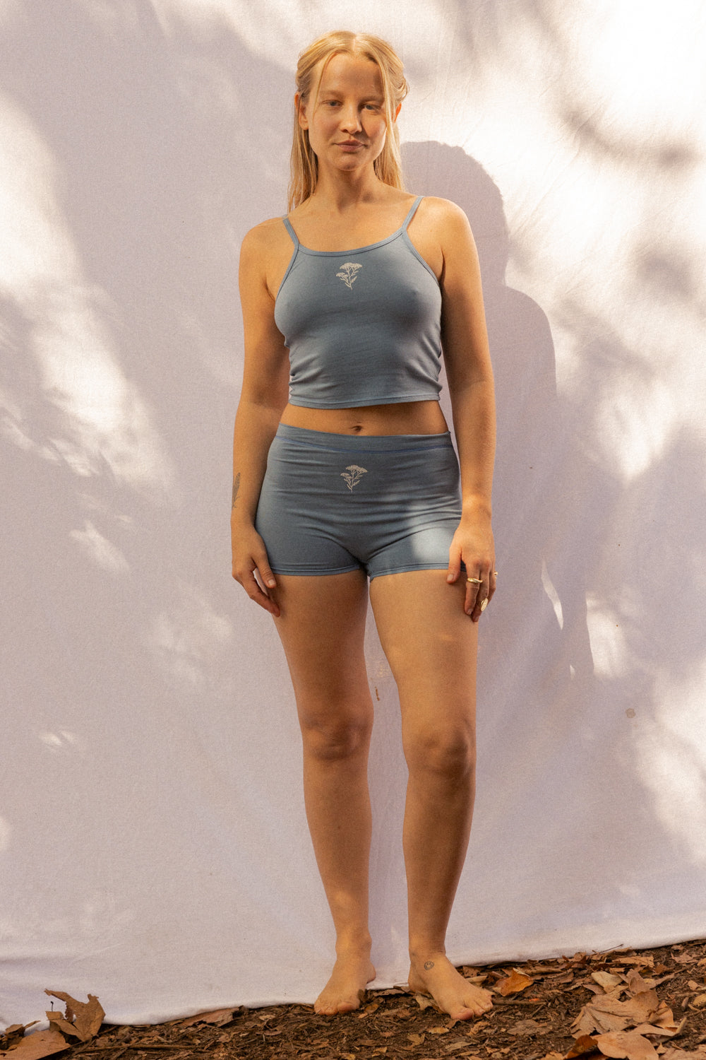 We use plant-based fabrics like TENCEL™ lyocell, ECOVERO™ viscose, and organic cotton, blended with Creora® bio-based spandex for gentle stretch. While the spandex still contains some petroleum, it’s partially derived from renewable sources—making it a better option than traditional synthetics. The result: soft, breathable, lower-impact clothing that feels as good as it is.