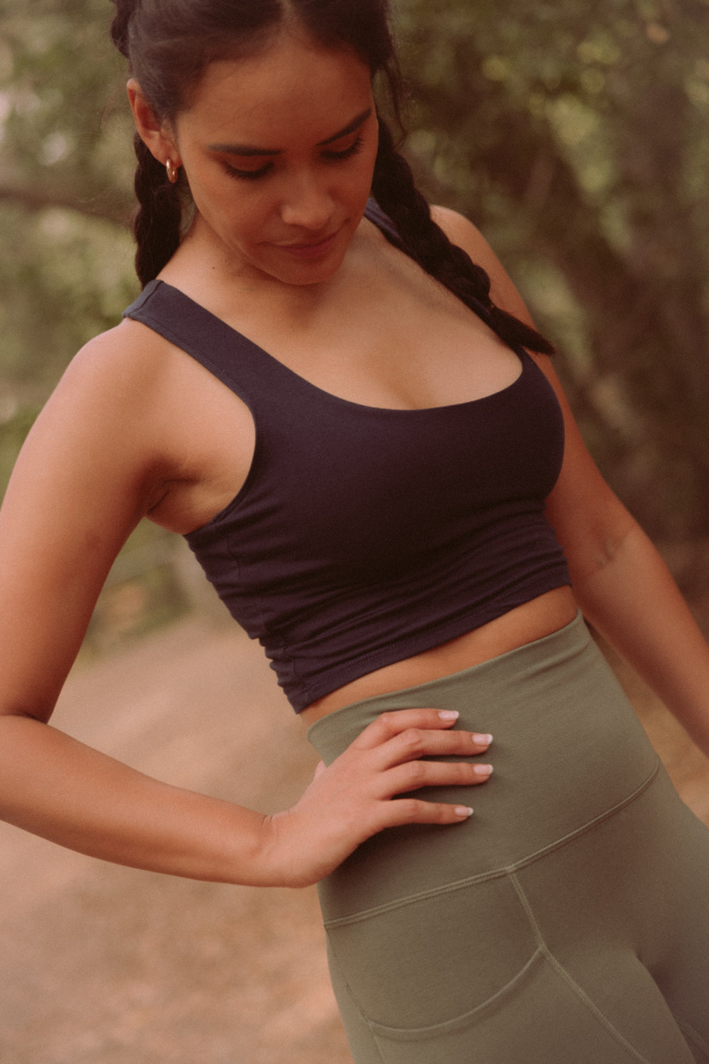 We use plant-based fabrics like TENCEL™ lyocell, ECOVERO™ viscose, and organic cotton, blended with Creora® bio-based spandex for gentle stretch. While the spandex still contains some petroleum, it’s partially derived from renewable sources—making it a better option than traditional synthetics. The result: soft, breathable, lower-impact clothing that feels as good as it is.
