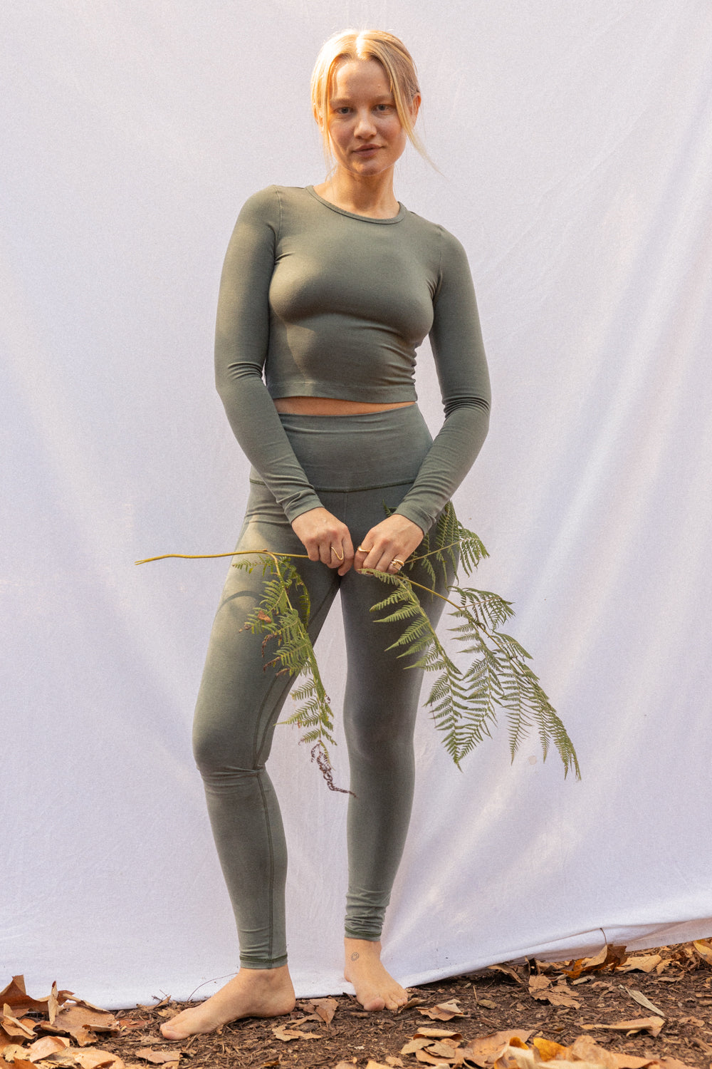 We use plant-based fabrics like TENCEL™ lyocell, ECOVERO™ viscose, and organic cotton, blended with Creora® bio-based spandex for gentle stretch. While the spandex still contains some petroleum, it’s partially derived from renewable sources—making it a better option than traditional synthetics. The result: soft, breathable, lower-impact clothing that feels as good as it is.